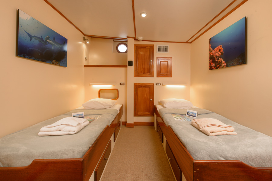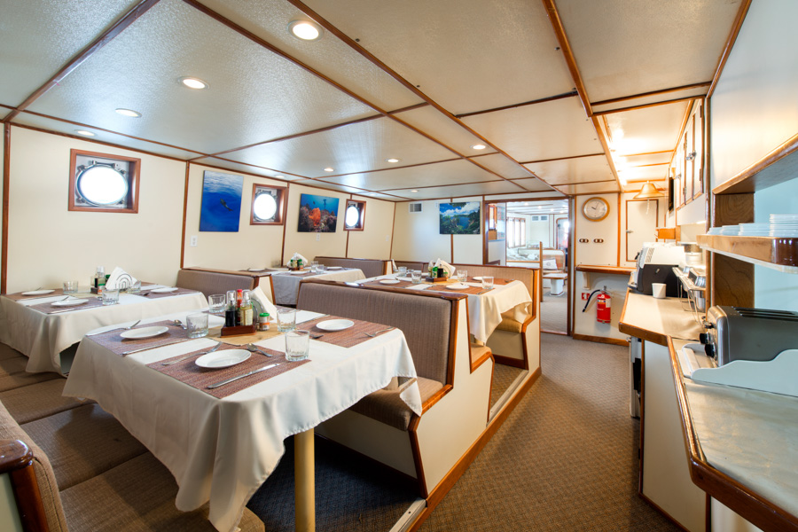 This spacious boat is everything a serious diver or photographer could wish for. Features include individual gear storage, private camera/strobe storage shelves with 110 & 220-volt AC power, zero-speed stabilizers and even a private washer and dryer for your towels and bathing suits. Her roominess and user-friendliness will introduce you to a new level of live-aboard comfort.